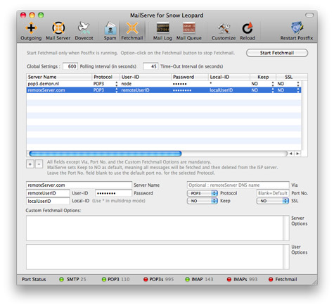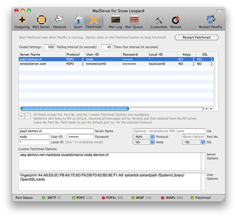 poll "pop3.demon.nl" protocol POP3 timeout 45 aka demon.net mailstore localdomains node.demon.nl user "node" password "paword" is * here fetchall ssl sslfingerprint "44:A8:E9:2C:FB:A9:7E:6D:F9:DB:F3:62:B2:9E:F1:A9'" sslcertck sslcertpath /System/Library/OpenSSL/certs