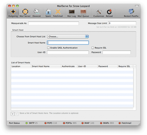 If you need to keep a list of Smart Hosts, for when you are on different networks or locations, store them in MailServe's Smart Host list. You can pick them up in the popup menu when you're setting the Smart Host.