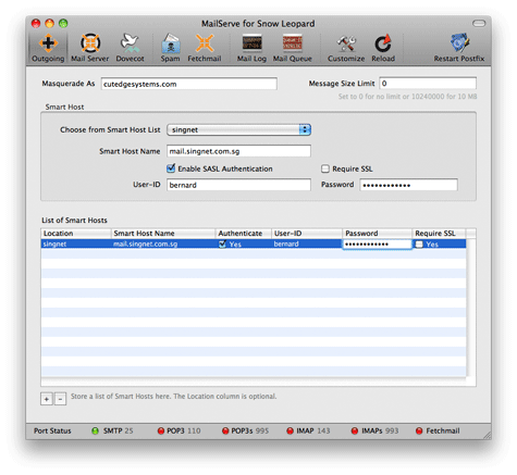 Note : if the Smart Host needs to be contacted on a port other than 25, add the port number after the Smart Host name, after a colon. Like this : mail.singnet.com.sg:587