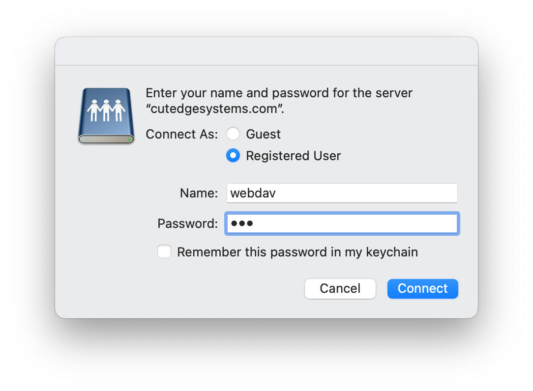 With WebDAV turned on, your web server acts like an iCloud Drive, allowing you to connect to the WebDAV folder remotely, securely, and directly from the Finder, so you can save, share, and distribute your files and folders.