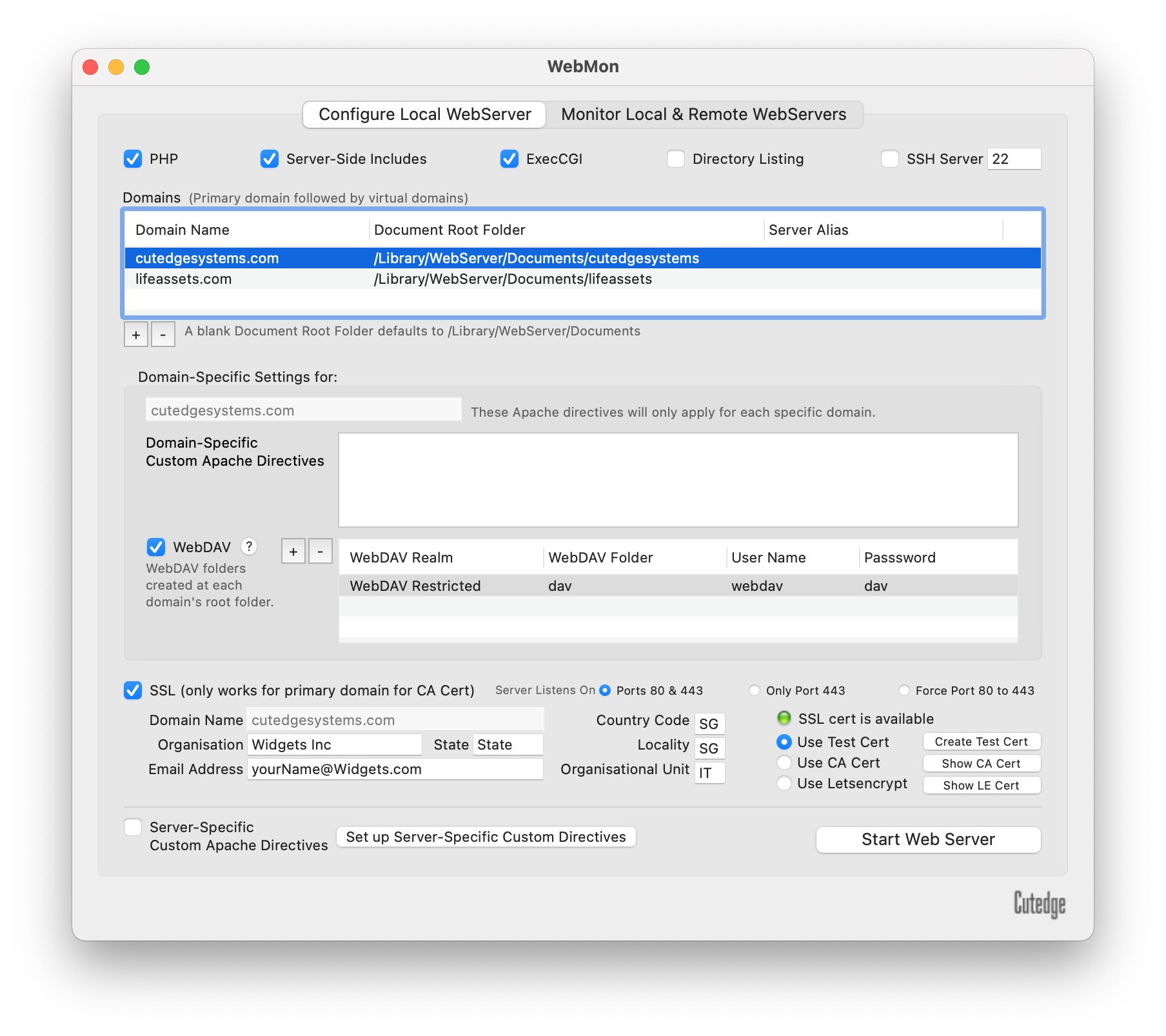 WebMon configures OS X's built-in web server to support server-side includes, execCGI, PHP, SSL (including support for inserting Intermediate CA certs) and WebDAV, for multiple domains running on the same server.