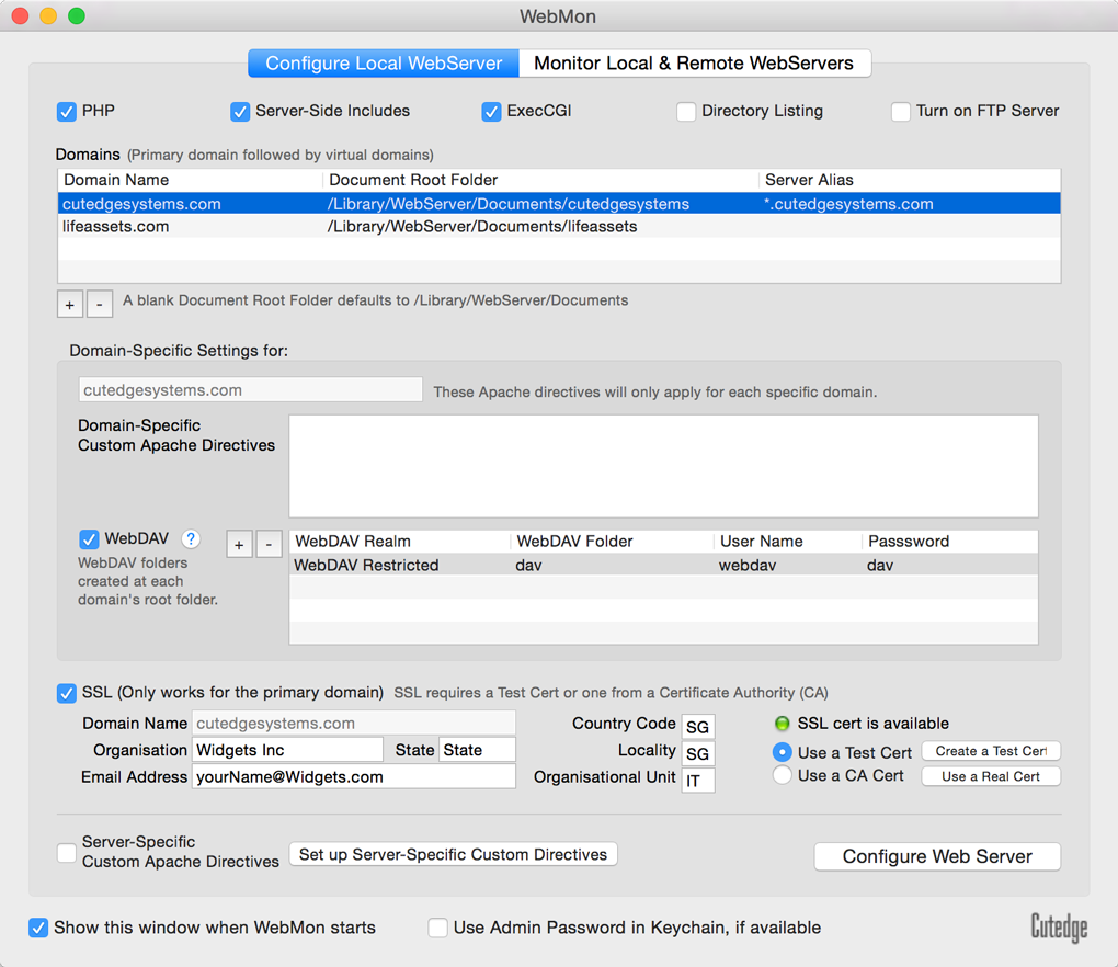 This option can be easily turned on with the use of a test cert that WebMon can help you generate (the "Create a Test Cert" button). First, make sure that the domain name that you're using to access the server is entered into the Domain Name field into the first column of the first record in the list of domains hosted by your web server (the main domain), like cutedgesystems.com, above. Then make sure to create the test cert. Then select the "SSL" and "Use a test certificate" options and hit Configure Web Server, and you will be able to access the web server by its domain name over SSL. Once you have an idea of how your web site might work with SSL on, you might want to get a real "live" cert from a Certification Authority (CA) like RapidSSL.