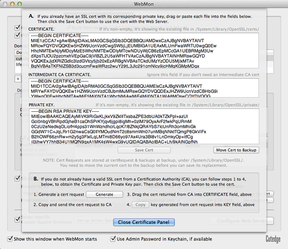 WebMon will also allow you to import a pre-existing live certificate to be used with the web server. Just drag or paste the certificate and private key pair into their corresponding fields. and click "Save Cert". WebMon will then stash them into the right places in the /System/Library/OpenSSL/ folder for SSL to work when you hit the Configure Web Server button as you get out of the cert management dialog.
