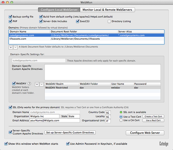 This option can be easily turned on with the use of a test cert that WebMon can help you generate (the "Create a Test Cert" button). First, make sure that the domain name that you're using to access the server is entered into the Domain Name field into the first column of the first record in the list of domains hosted by your web server (the main domain), like cutedgesystems.com, above. Then make sure to create the test cert. Then select the "SSL" and "Use a test certificate" options and hit Configure Web Server, and you will be able to access the web server by its domain name over SSL. Once you have an idea of how your web site might work with SSL on, you might want to get a real "live" cert from a Certification Authority (CA) like RapidSSL.