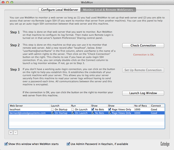If you're able to get a list of the log records via username@localhost, it shows that your SSH Remote Login set up is working correctly. You can now go on to the final step, knowing that any problems connecting to your server from a remote machine is probably due to either time-out problems from a slow network, or due to firewall or other network issues, rather than an inability to set up the Remote Login connectivity properly. Final Step Assuming that our server can be reached via a domain name cutedgesystems.com, say, we now run WebMon on a remote machine, e.g., the administrator's personal iBook or PowerBook. We add a server for WebMon to monitor, as shown below :