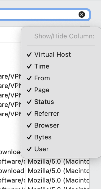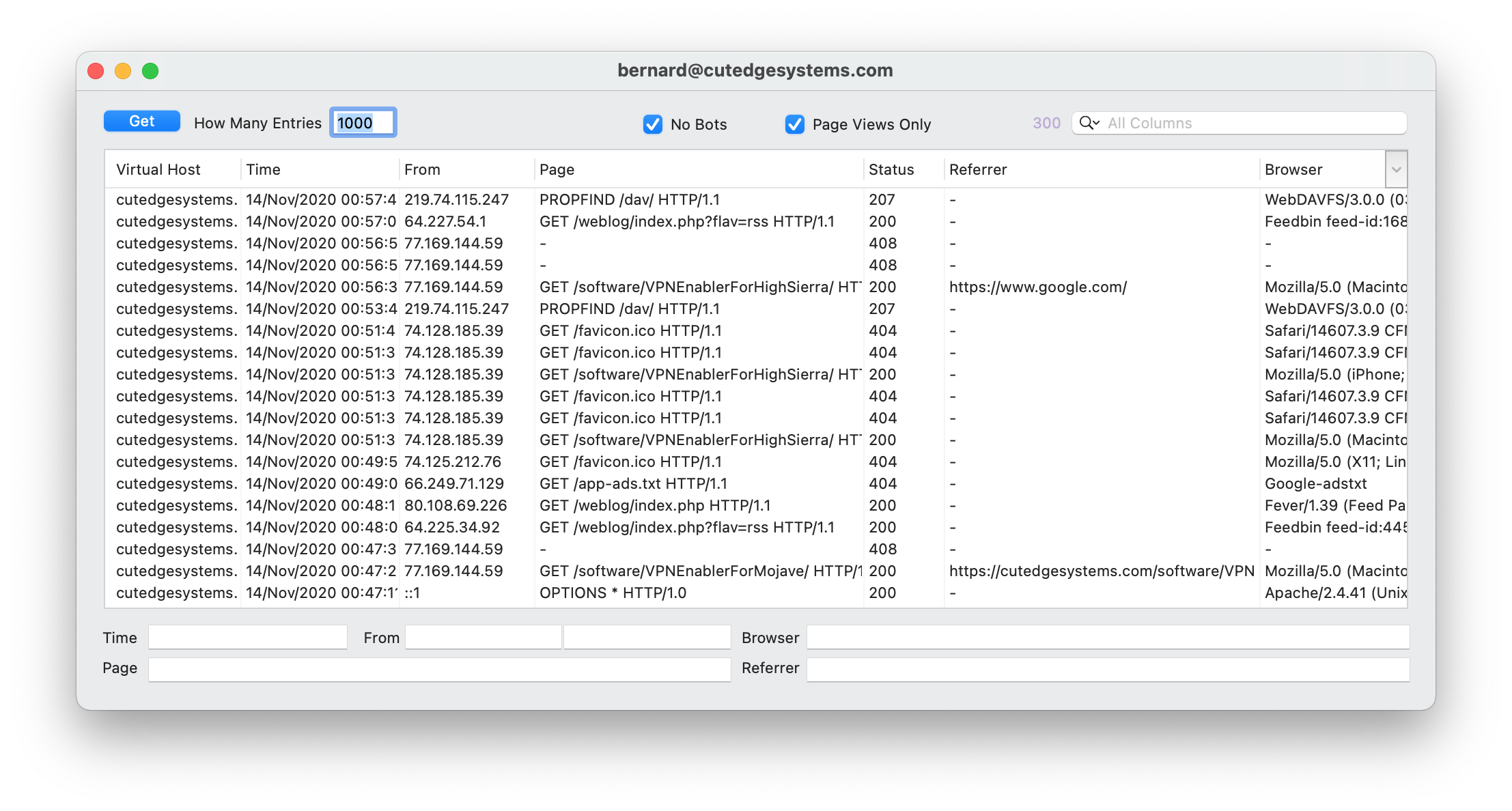 WebMon's log window allows you to set the number of records you want to retrieve from the log file at /var/log/httpd/access_log, whether you want to ignore hits from bots and crawlers, and whether you want to show only page views and ignore the hits on images.
