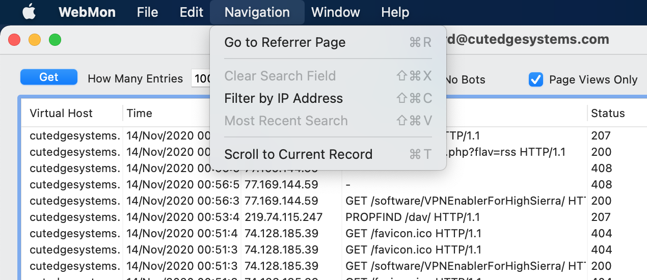 If the hit has a referrer, double-clicking on the record will launch the referrer page. With a record selected, you can do a Shift-Command-C and copy its IP address to the Search Field. This will immediately filter the display to show only the hits coming from this IP address, and this is useful for tracing the path taken by one particular browser through your web site.