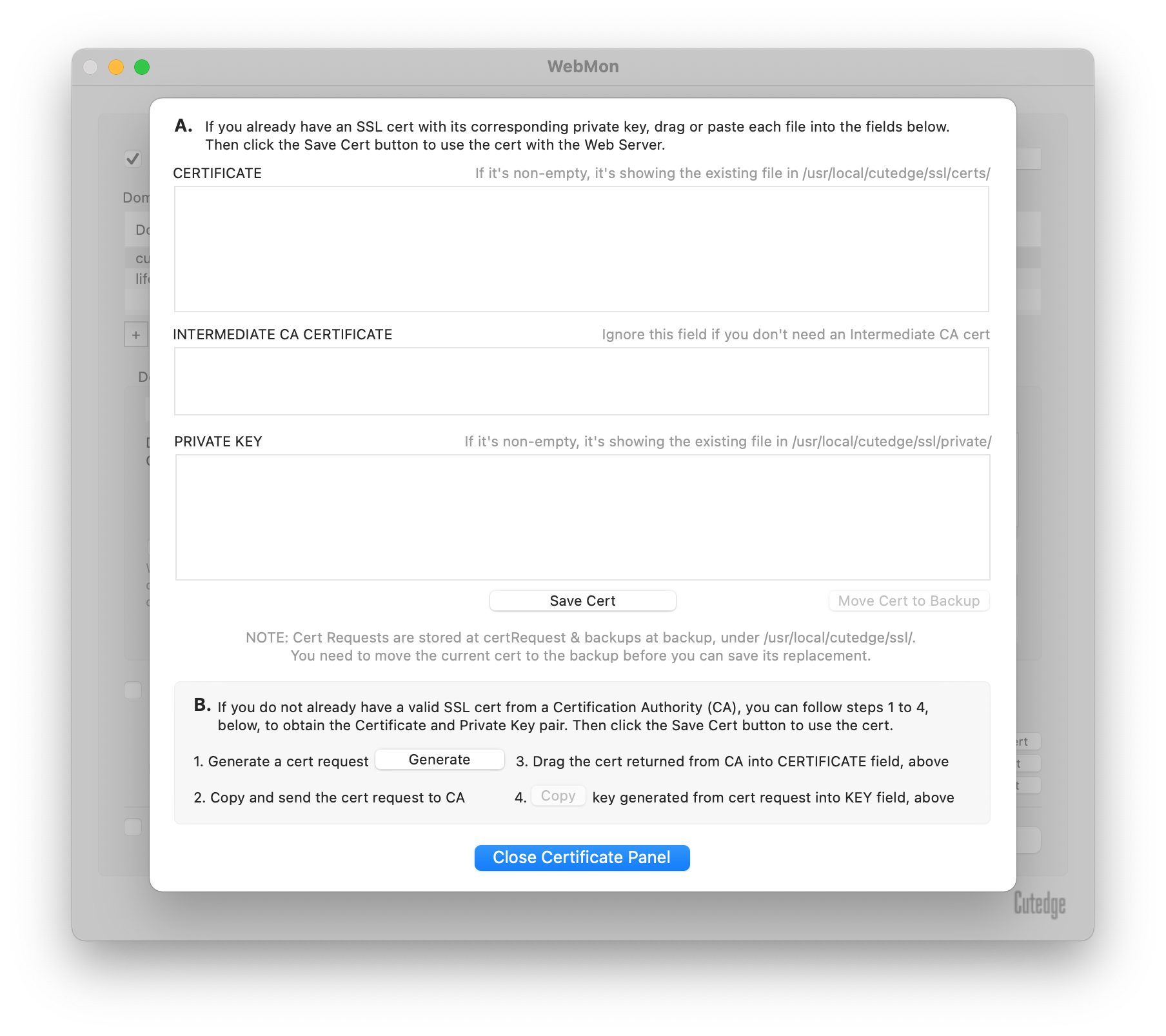 WebMon will also allow you to import a pre-existing live certificate to be used with the web server. Just drag or paste the certificate and private key pair (and intermediate cert) into their corresponding fields. and click Save Cert. WebMon will then stash them into the right places in the /usr/local/cutedge/ssl/ folder for SSL to work.