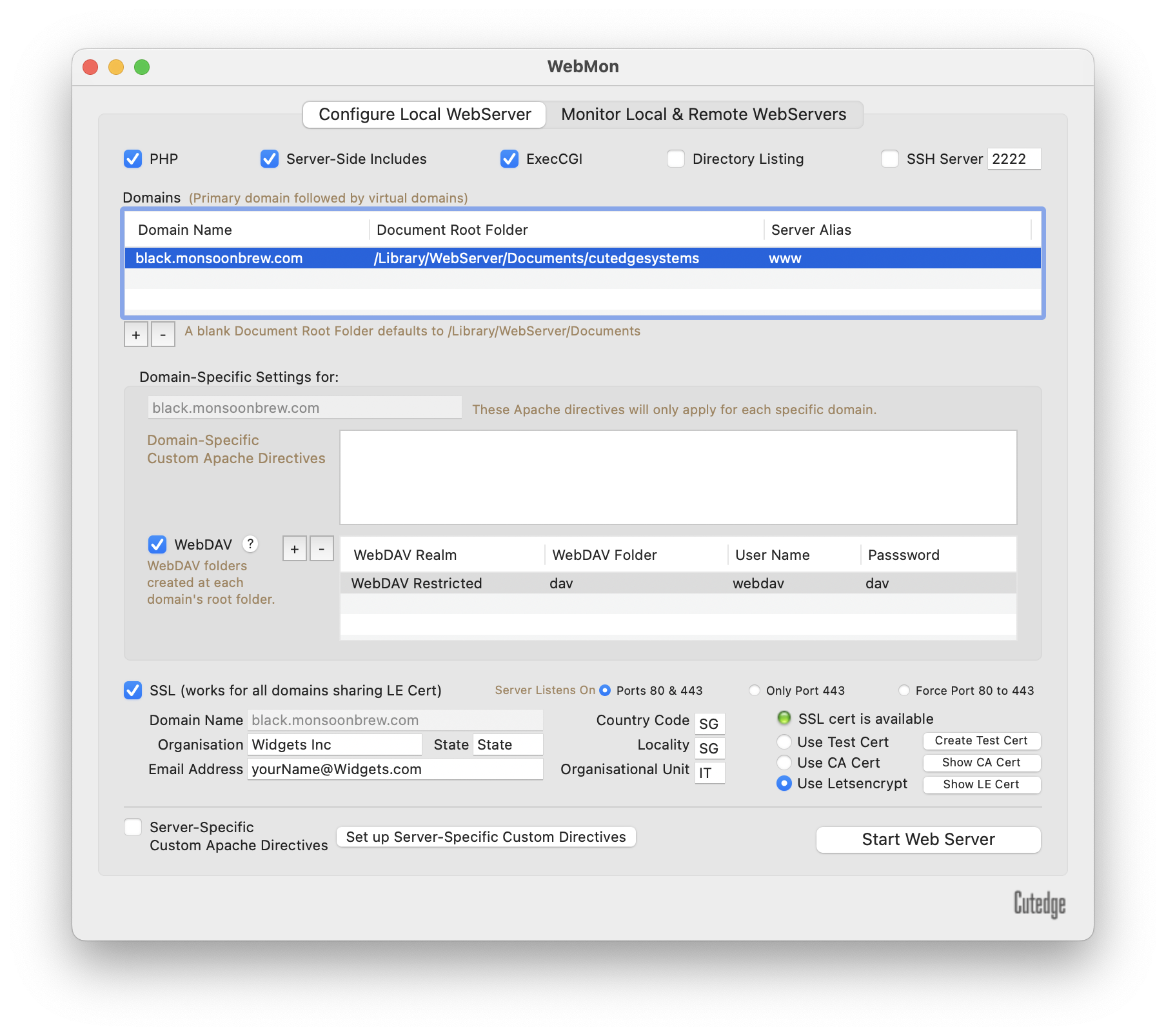 WebMon configures OS X's built-in web server to support server-side includes, execCGI, PHP, SSL (including support for Letsencrypt certs) and WebDAV, for multiple domains running on the same server.