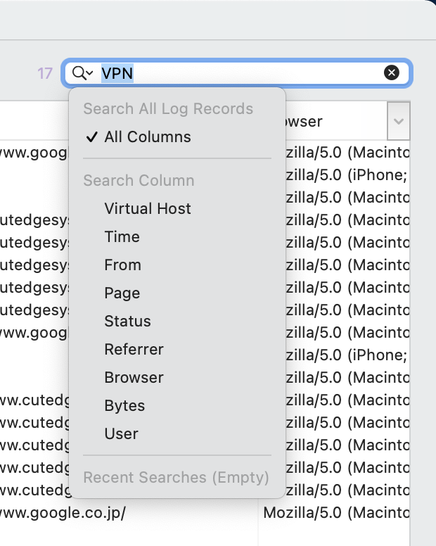 If the hit has a referrer, double-clicking on the record will launch the referrer page. With a record selected, you can do a Shift-Command-C and copy its IP address to the Search Field. This will immediately filter the display to show only the hits coming from this IP address, and this is useful for tracing the path taken by one particular browser through your web site.