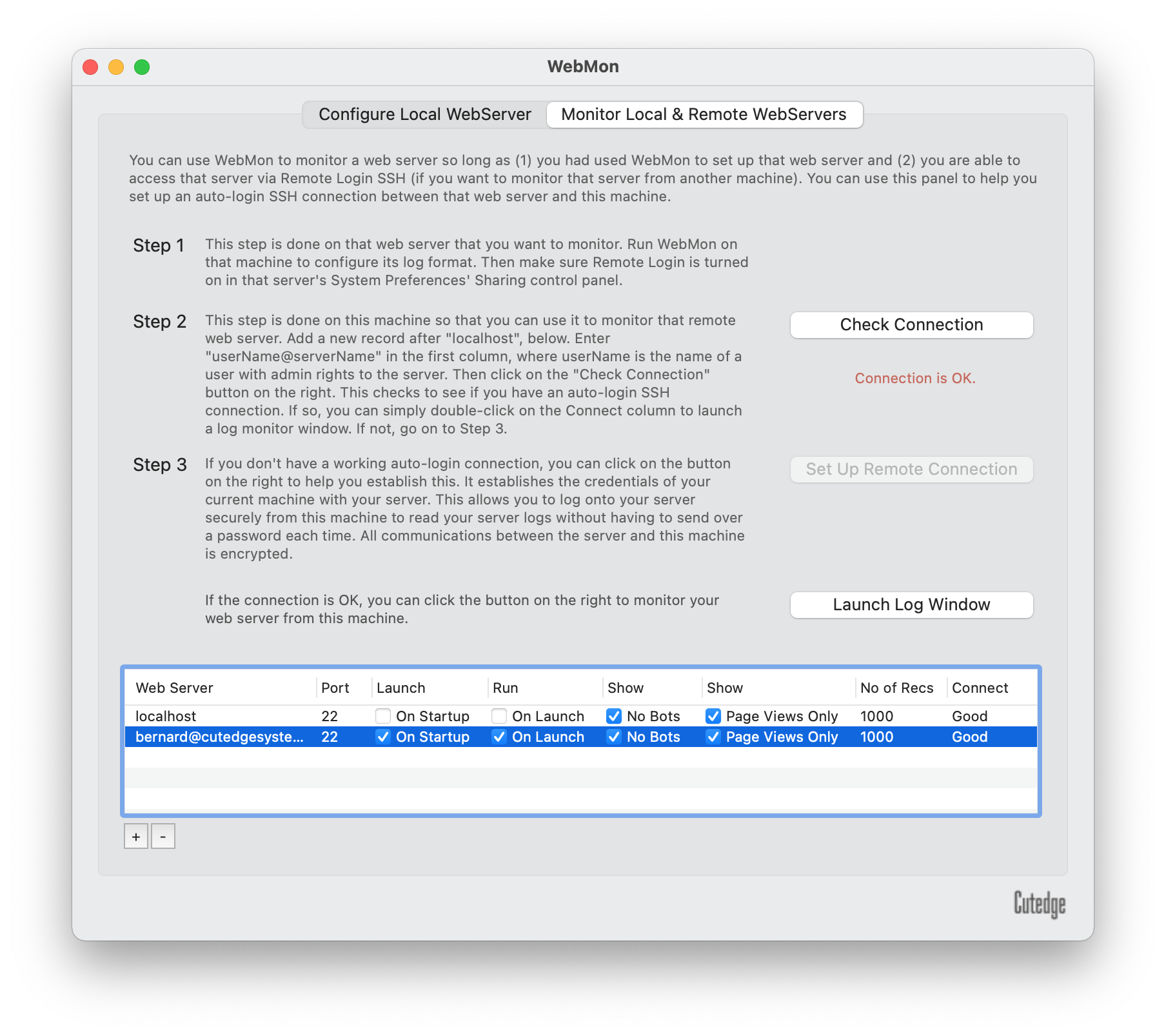 Now with username@localhost selected, we click on WebMon's Check Connection button. If SSH is not yet set up, WebMon will warn us and turn on its Set Up Remote Connection button :