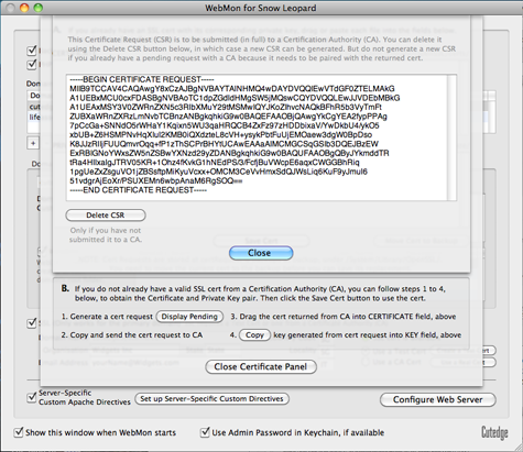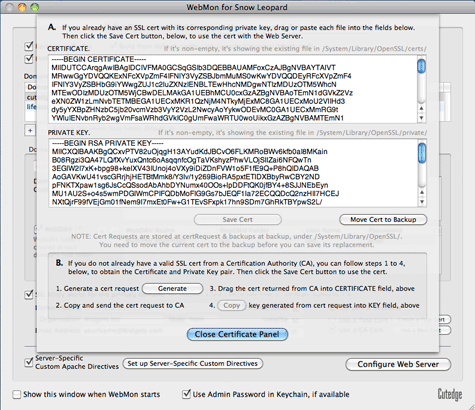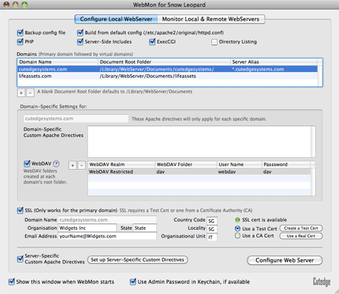 | What is WebMon? WebMon configures OS X's built-in web server to support server-side includes, execCGI, PHP, SSL and WebDAV, for multiple domains running on the same server. With WebDAV turned on, your web server acts like an iDisk, allowing you to connect to the WebDAV folder remotely, securely, and directly from the Finder, so you can save, share, and distribute your files and folders. You can also use the WebDAV folder to share your iCal calendars. WebMon also helps you set up the web server so that you can monitor its log file from a remote machine. WebMon is able to help you monitor any number of web servers from a single remote machine.   Configuring OS X's built-in Web Server When you first run WebMon on the server machine, you will see WebMon's "Configure Web Server" window, above. The first panel in the WebMon's "Configure Web Server" window allows you to turn on PHP, Server-Side Includes, execCGI and WebDAV, and turn off Directory Listing, while giving you the option to make a back-up of the current config file, build from the default Apache config file, or base it on the one you have existing on your server. New with WebMon for Snow Leopard is the ability to configure your server to host multiple domain names on the same physical machine. Turning on WebDAV You can create multiple WebDAV folders, each with its own user name and password combination. There is a WebDAV Help button, that will show you how the four editable WebDAV parameters - WebDAV Realm, WebDAV folder, User Name and Password - will appear in the OS X authentication dialogs when you try to publish an iCal calendar or access a WebDAV folder from the Finder's "Go / Connect to Server" Menu. There is also a "Turn on Directory Listing" check box which will turn on auto-listing of directories, for when you want to share folders of files and images with people who have not been given write access to that directory. Sharing iCal Calendars Once you have WebDAV turned on, you can start sharing iCal calendars on the server. The following picture shows you how to set up iCal to publish your calendar, assuming that you're using the default values for the name of the WebDAV folder, login ID and password :  The following shows the result of a successful operation :  Sharing Files and Folders like an iDisk You can make the WebDAV folder act like your very own .Mac iDisk. This is how you can connect to it remotely, directly from the Finder. From the Finder menu, choose Go and then Connect to Server. You will see the dialog box below. Enter the domain name or the IP address of the web server that you have just set up using WebMon (in place of 10.0.1.205). Also, note that the protocol used is http and not afp or ftp :  If your server is accessible and WebDAV is running, you will be asked to authenticate with it. Enter the WebDAV user ID and password (default "webdav" and "dav" respectively, unless you have changed it) :  If you authenticated correctly, you will see your WebDAV folder directly on your desktop and you can drag files and folders onto it. Unlike ftp, you can actually double-click on these documents, launch the application (in my case, Keynote, because I have a Keynote document), and make changes to it.  WebDAV is "better" than using ftp because you have one less port to open (it uses the web server's port 80). It is a bit faster. And it integrates smoothly with the Finder, allowing you to work with the WebDAV folder like any ordinary Finder folder. Setting up SSL WebMon for Snow Leopard has an improved interface for managing SSL certs. When SSL is turned on at the server and the browser accesses the web server with an 's' added to the http call, like this : https://cutedgesystems.com/software/WebMon/ all communications between the server and browser will then be encrypted.  This option can be easily turned on with the use of a test cert that WebMon can help you generate (the "Create a Test Cert" button). First, make sure that the domain name that you're using to access the server is entered into the Domain Name field into the first column of the first record in the list of domains hosted by your web server (the main domain), like cutedgesystems.com, above. Then make sure to create the test cert. Then select the "SSL" and "Use a test certificate" options and hit Configure Web Server, and you will be able to access the web server by its domain name over SSL. Once you have an idea of how your web site might work with SSL on, you might want to get a real "live" cert from a Certification Authority (CA) like RapidSSL. WebMon will help you generate the Certificate Request that is needed by a CA, below. You can reach this dialog box by clicking on the "Use a Real Cert" button.  Once the certificate (text block) is returned from a CA, you can paste it back into WebMon, into the CERTIFICATE field, below. Make sure you retrieve the PRIVATE KEY it should be paired with by clicking on the "Copy" key button. WebMon will take care of saving it into the right place.  WebMon will also allow you to import a pre-existing live certificate to be used with the web server. Just drag or paste the certificate and private key pair into their corresponding fields. and click "Save Cert". WebMon will then stash them into the right places in the /System/Library/OpenSSL/ folder for SSL to work when you hit the Configure Web Server button as you get out of the cert management dialog.   Monitoring the Web Server, both local and remote WebMon provides a web monitor for you to monitor the web server, both locally on the server machine, as well as from a remote machine running another copy of WebMon, so long as you have Remote Login turned on at the server machine in Sharing Preferences in System Preferences. Panel 2 of WebMon ("Monitor Local & Remote WebServers") allows you to do that. If you are able to ssh (remote login) into your server machine from a remote machine, you should be able to use WebMon to monitor the server remotely from another machin