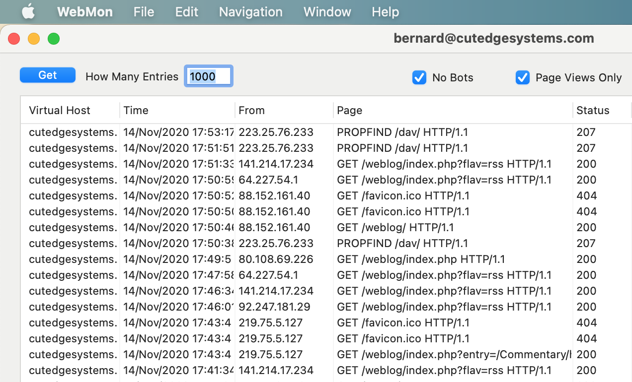 WebMon's log window allows you to set the number of records you want to retrieve from the log file at /var/log/httpd/access_log, whether you want to ignore hits from bots and crawlers, and whether you want to show only page views and ignore the hits on images.