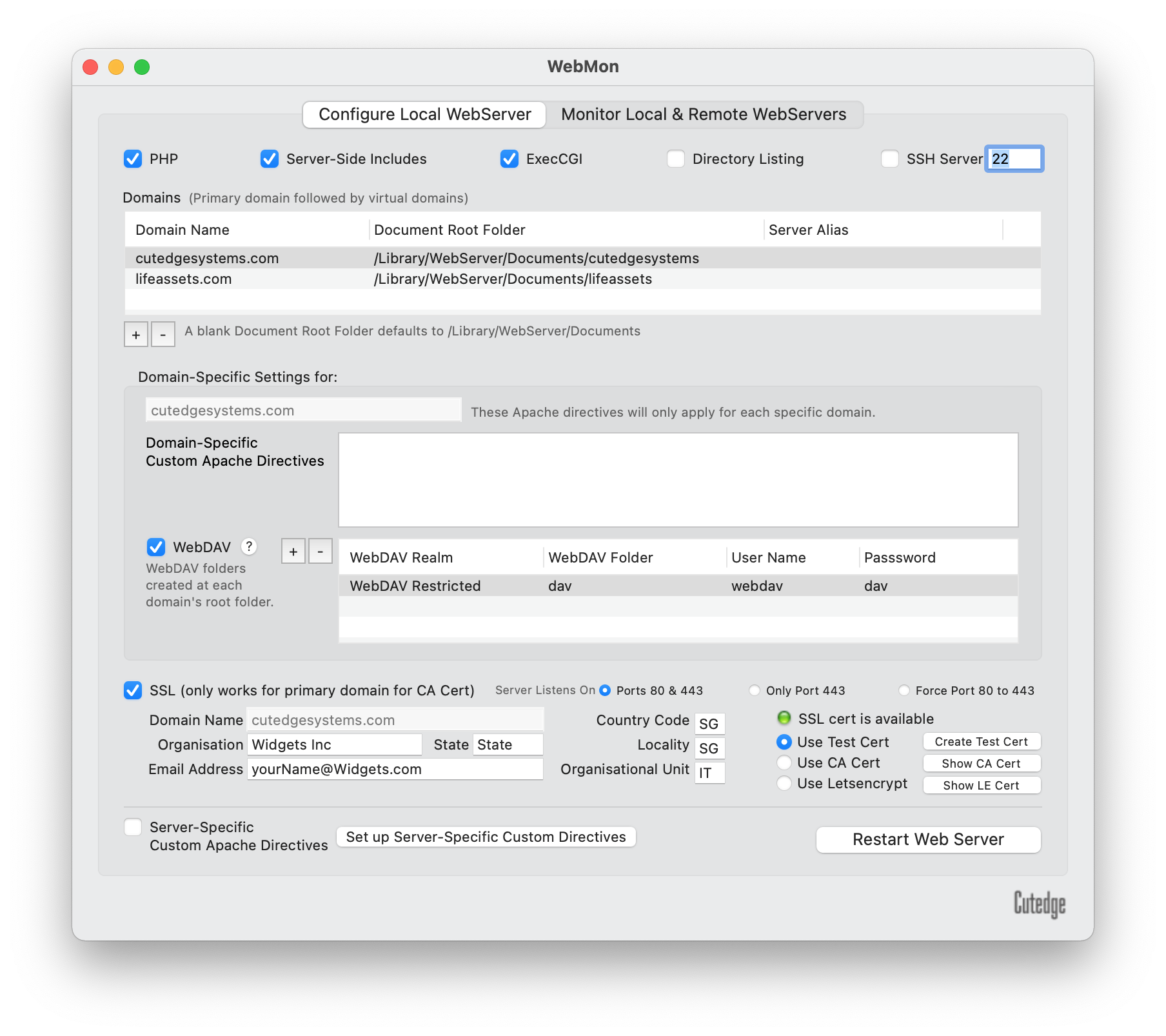 WebMon configures OS X's built-in web server to support server-side includes, execCGI, PHP, SSL (including support for inserting Intermediate CA certs) and WebDAV, for multiple domains running on the same server.