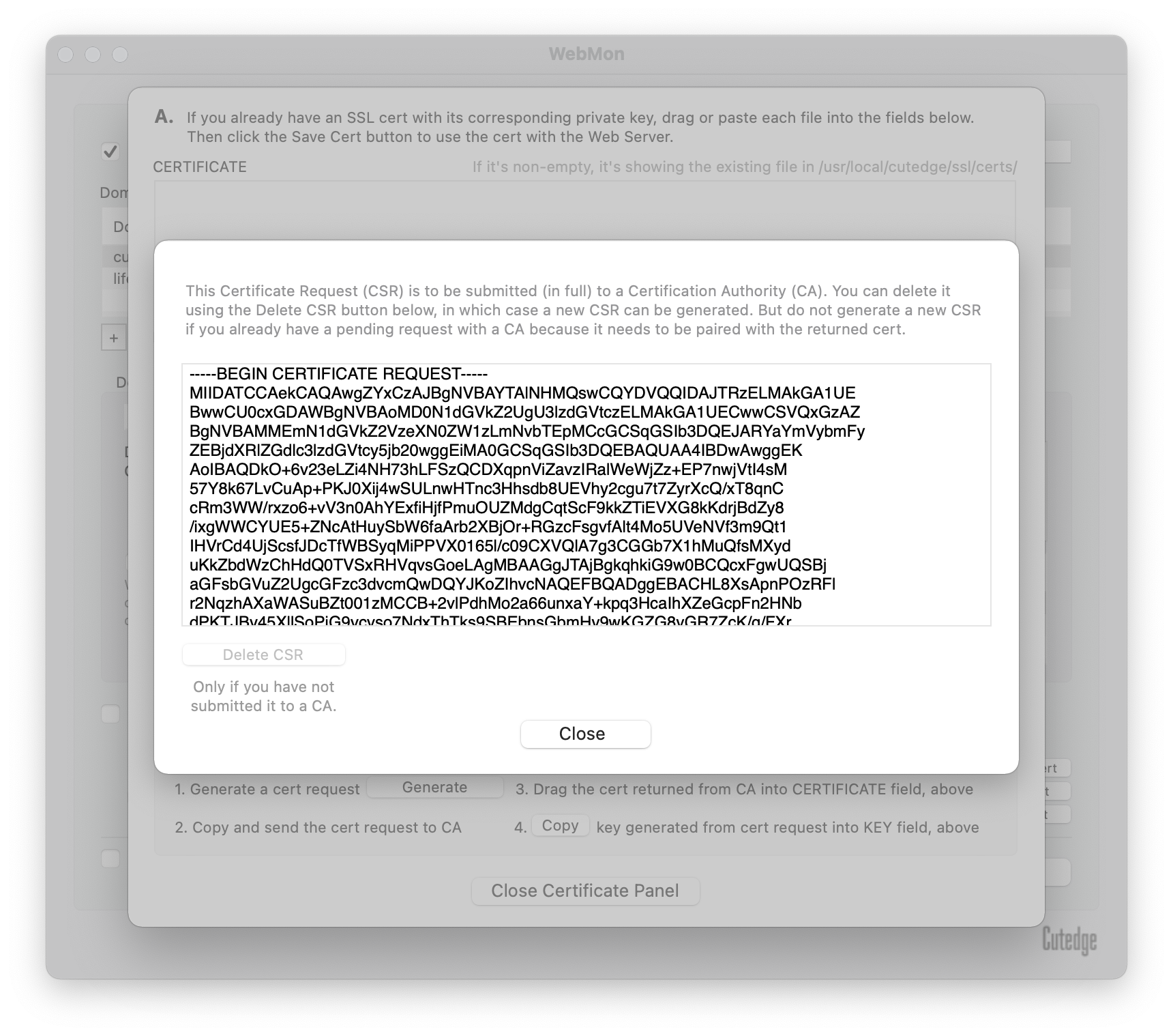 When the Certificate is issued and returned from a CA, you can paste the certificate (text block) back into WebMon, into the CERTIFICATE field, below.