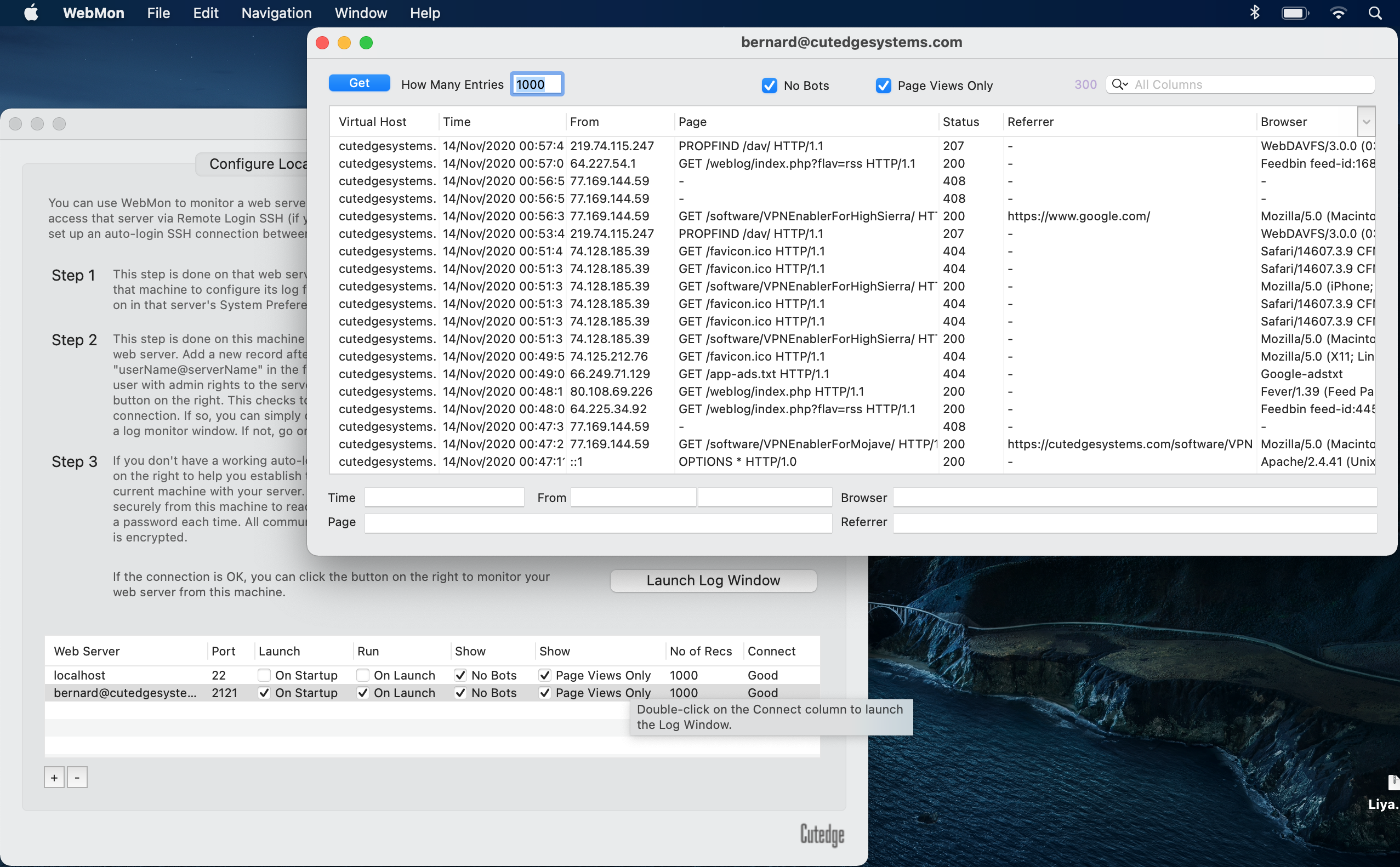 WebMon's log window allows you to set the number of records you want to retrieve from the log file at /var/log/httpd/access_log, whether you want to ignore hits from bots and crawlers, and whether you want to show only page views and ignore the hits on images.