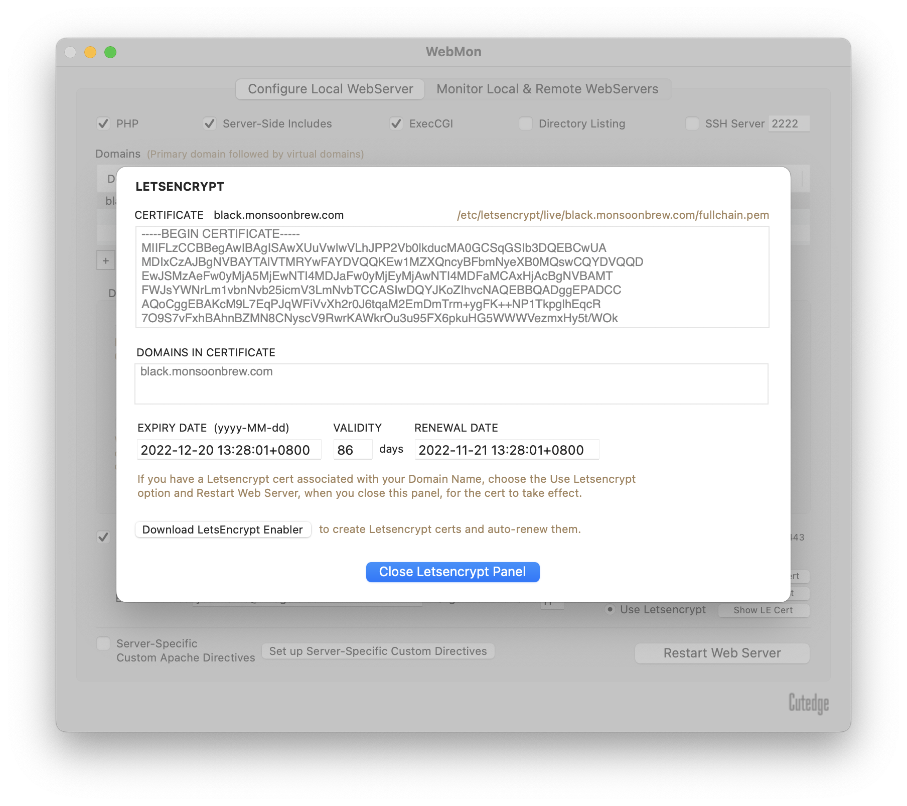 WebMon also offers a third and maybe even easier option — Letsencrypt certs created by Letsencrypt Enabler. Once you’ve created a Letsencrypt cert with your chosen WebMon-supported domain name, the Letsencrypt SSL option will be enabled. You can check that the cert exists, together with its expiry or renewal date, by clicking the Show LE Cert button.