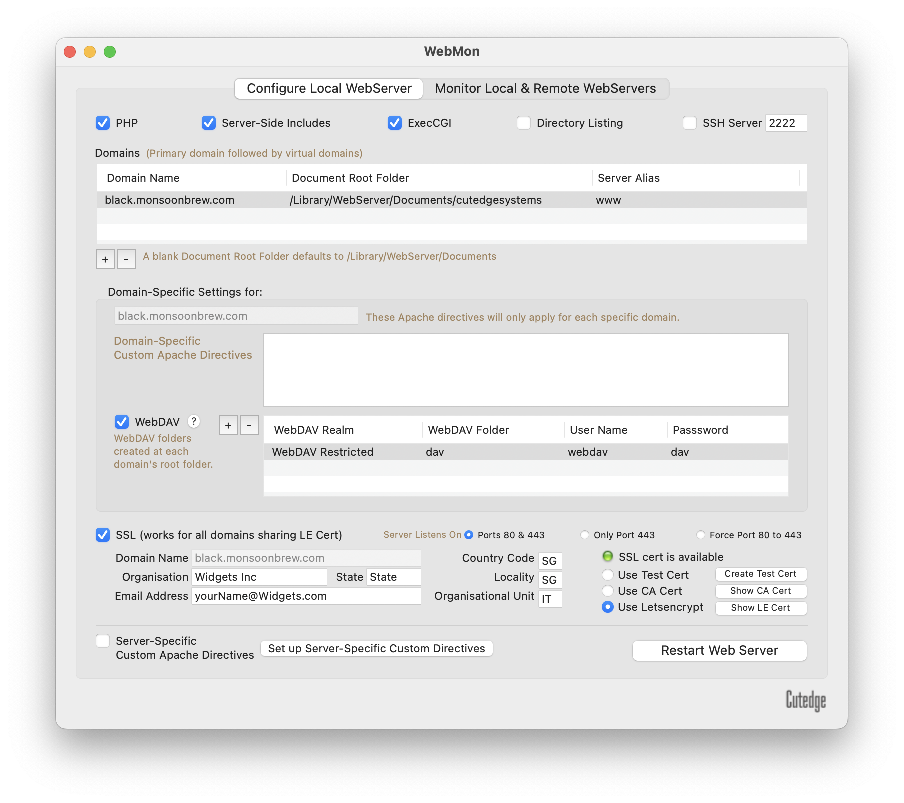 WebMon configures OS X's built-in web server to support server-side includes, execCGI, PHP, SSL (including support for Letsencrypt certs) and WebDAV, for multiple domains running on the same server.