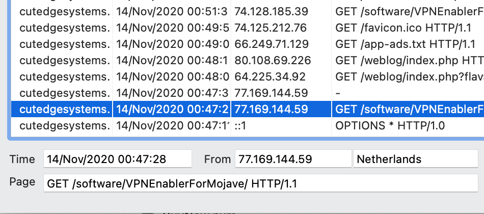 The column order can be re-arranged and re-sorted. WebMon will show you the details of each hit as you click on each row in the table, including the country from which the hit is being made, below :