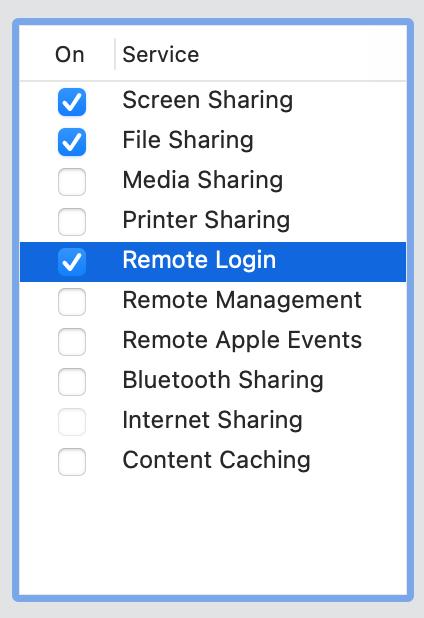 First you continue to work on the server and make sure that Remote Login (SSH) is turned on in the Sharing Preferences :