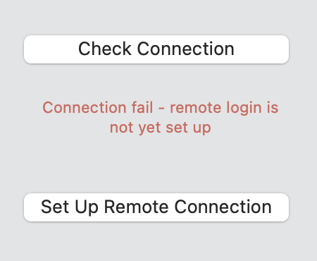 Now with username@localhost selected, we click on WebMon's Check Connection button. If SSH is not yet set up, WebMon will warn us and turn on its Set Up Remote Connection button :