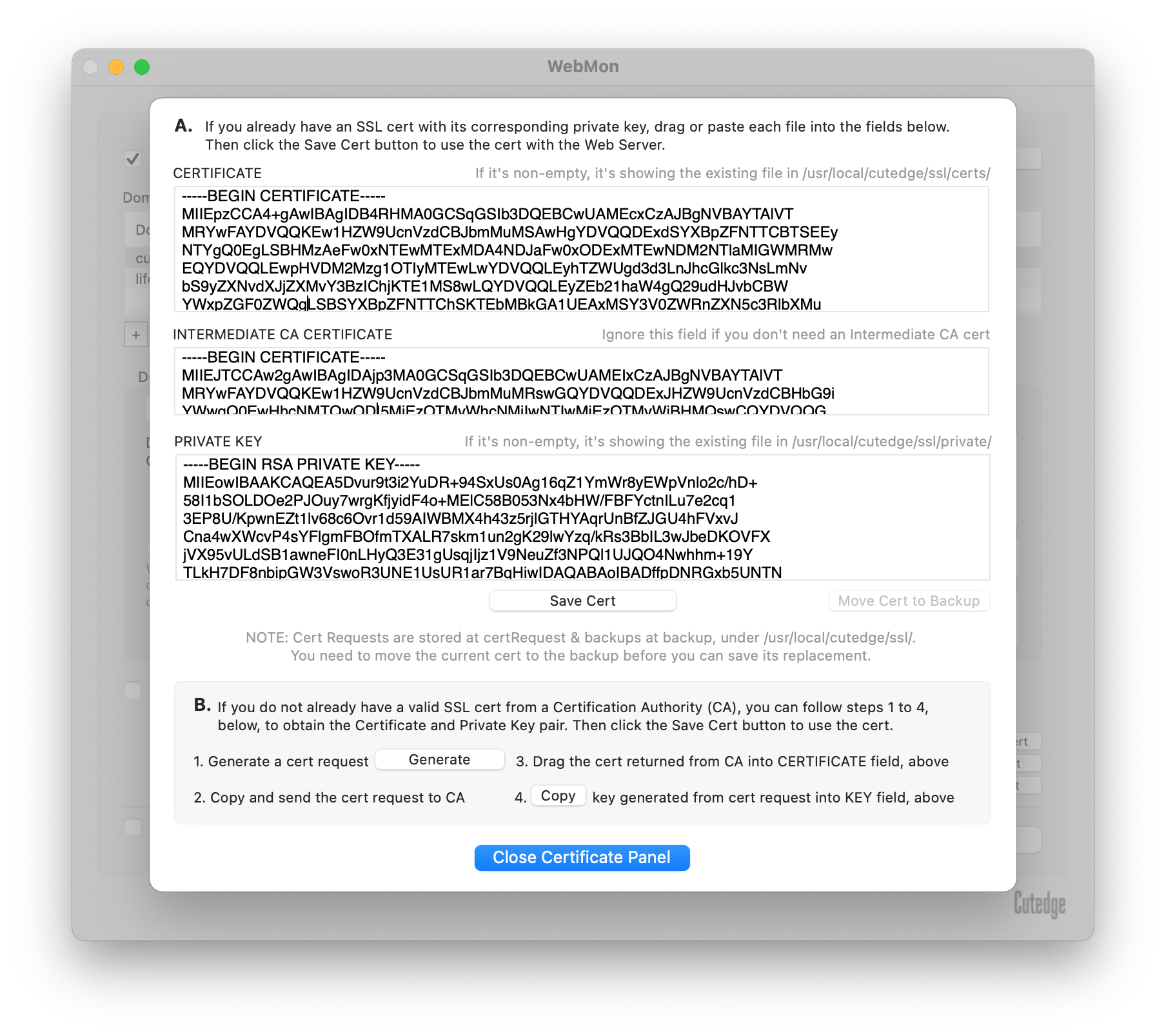 WebMon will also allow you to import a pre-existing live certificate to be used with the web server. Just drag or paste the certificate and private key pair (and intermediate cert) into their corresponding fields. and click Save Cert. WebMon will then stash them into the right places in the /usr/local/cutedge/ssl/ folder for SSL to work.