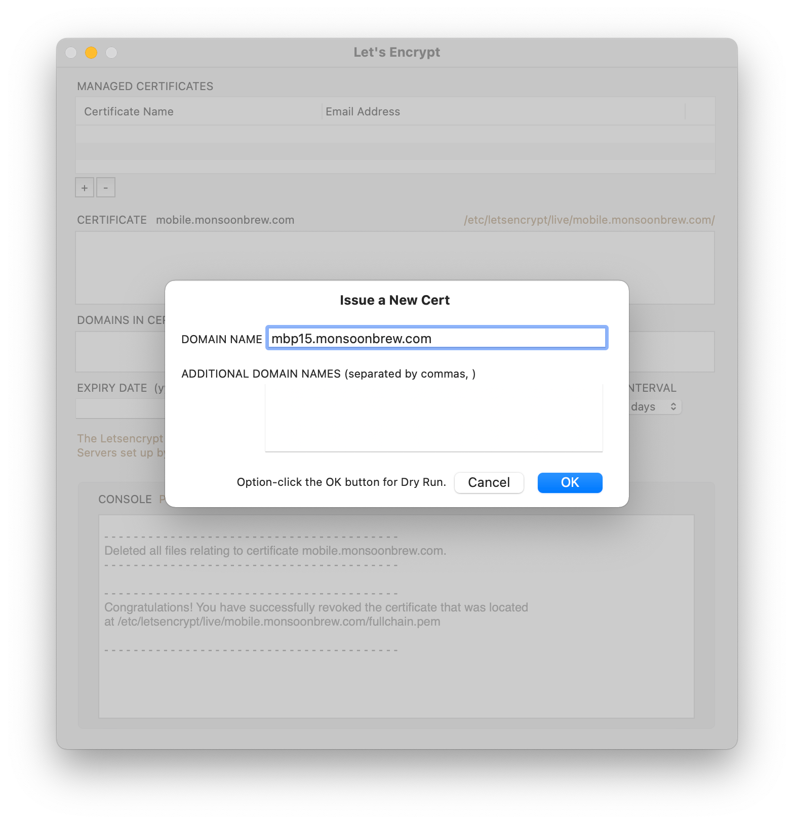 2.0.4 February 16th 2021. This version improves on the basic features of the first version. Now the user can start or stop an automated cert renewal job, check the status to see if the job is running and start it if it is not running. The user can now modify a cert, adding to or removing domain names from the cert by double-clicking on a cert record to bring up a dialog box to make the modifications. And, very useful for debugging, the user can now do a dry-run when they're creating or modifying a cert. Just Option-click on the OK button to tell the app that this should be a dry-run. The Console log will show if the cert will be created correctly.