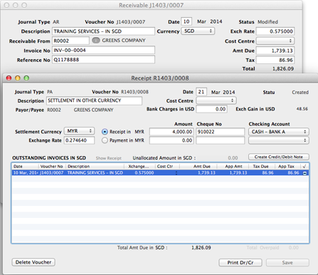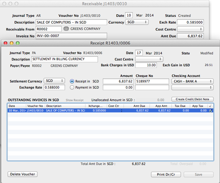 Settlement In Billing Currency The following is an example of an invoice billed in a foreign currency, and settled in the same billing currency.