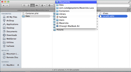Luca stores the accounting data in a SQLite database, called Lucadb, created by default in the following Documents folder: ~/Library/Containers/com.cutedgesystems.Mavericks.Luca/Data/Documents