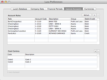 Special Accounts Certain accounts play important roles in the accounting system, e.g., you need to have an account to post Foreign Exchange Gain/Loss amounts to, and you need an account to post the year's Retained Earnings to, and you need to set up Checking Accounts that are linked to your bank accounts. These are set up in the following Preference pane, which you can use to assign a different account to play the selected role instead (if you had not yet made any postings to that special account) :