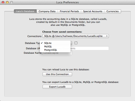 Exporting the Database Luca works with a built-in SQLite database and also with PostgreSQL and MySQL. You can use the following Preference Pane to export the accounting data in Luca's built-in SQLite database to any SQLite, MySQL 5.6 or PostgreSQL 9.3 database for which you have database creation rights: