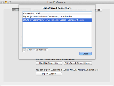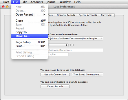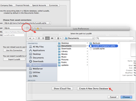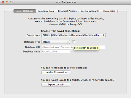 - Change the default database path in Luca Preferences. Click the path icon next to the Database Type, select the database path, and click the "Use this Connection" button to re-load the Chart of Accounts. You can also select the Database Type MySQL or PostgresSQL.