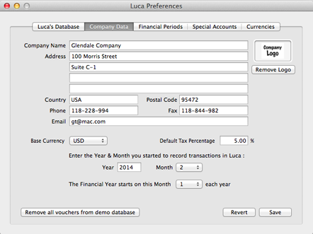 Setting the Preferences All the Preference Settings and Utility windows are found in a single Luca Preferences window: Company Data This Preference pane lets you set up the base currency code, default tax percentage, the period in which you start recording transactions in Luca and the start of your accounting month in your accounting year cycle. You can drag and drop a Company's Logo image file into the box provided in this pane. The Company's Logo image will be printed on listings and printouts. You can also remove the logo by clicking the "Remove Logo" button.