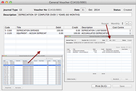 Note: In each of the following Journal screens, you can print the Journal in the screen format, or press the Shift key to print in the double-entry format. General Vouchers Transactions can be entered as double-entries in Journal > General Vouchers. An example of such a transaction is the record, Depreciation of Equipment, as shown here :