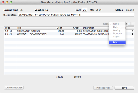 Creating Recurring Vouchers Recurring vouchers can be created for General Vouchers, Cash Receipts or Disbursements, and Receivables or Payables. The recurring voucher is created as you would for a normal voucher. The parameters for generating recurring vouchers is configured by selecting the "Edit..." option from the pull-down menu for repeating a voucher.