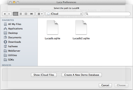 Using iCloud To share the Luca SQLite database file in iCloud with Luca on your other Macs and iPad devices, choose the file from the saved connections list in Luca Preferences and select "Move To…" from the Finder menu. Navigate to the iCloud location and save.