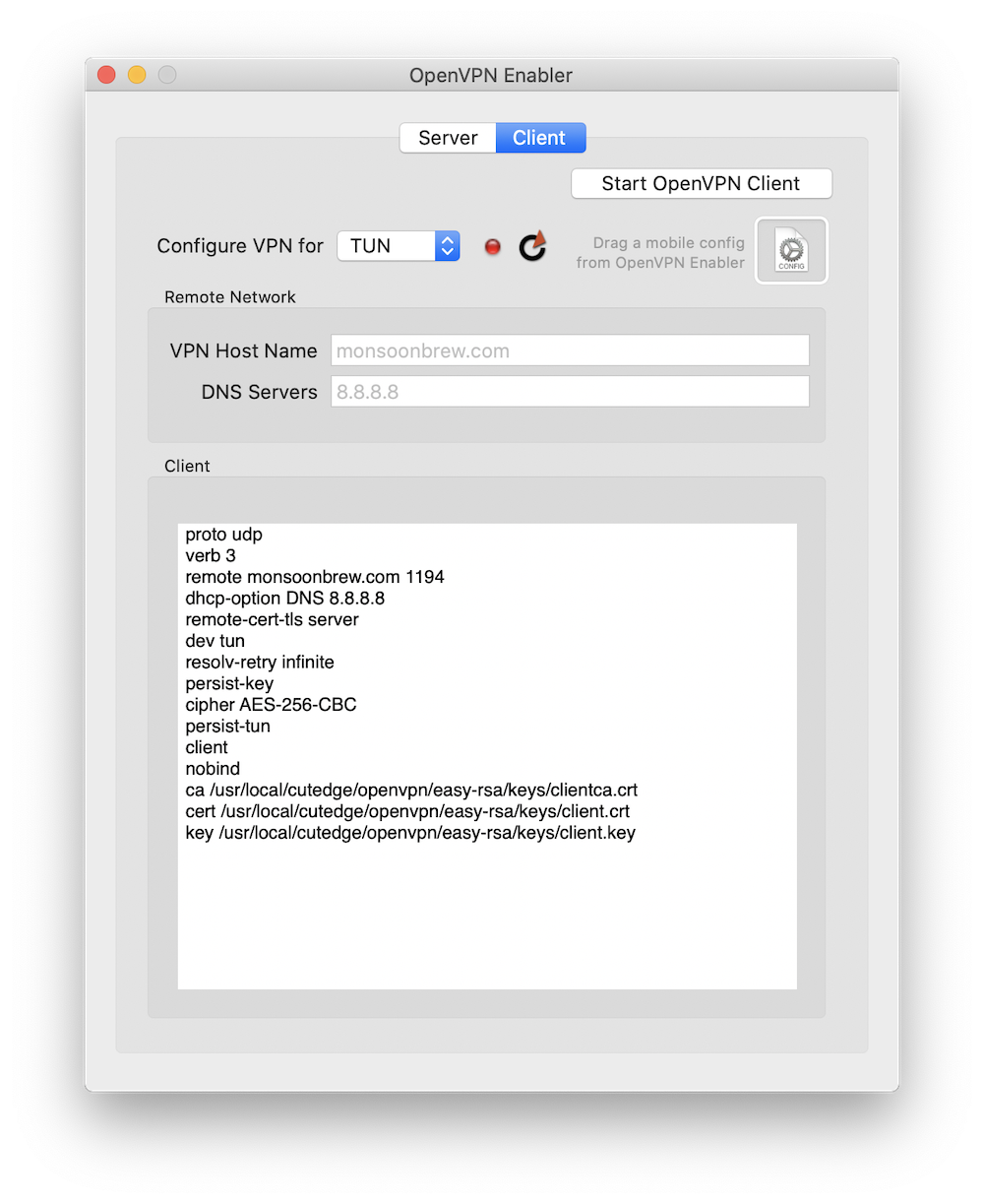 b. If the client is a Mac — now we need an app. The OpenVPN app for MacOS is very Windows-centric. And so I wrote a Mac OpenVPN client and merge it in the same app as the one that enables the Server. Use the same OpenVPN Enabler app in the targetted client Mac, but use the Client tab. Drag the exported mobileconfig file onto a “well” just below the Start OpenVPN Client button.Once the file is dropped on the well, the OpenVPN Client app will extract the client parameters from the profile and set up the VPN client config. Then you’re ready to hit the Start OpenVPN Client button.