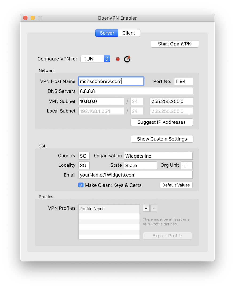 Enter the Domain Name (VPN Host Name field) of the machine you want to run OpenVPN Enabler on. That Domain Name must be publicly accessible from the Internet. Then, click on the Suggest IP Addresses button. Make any custom changes to those IP address fields, if necessary. Finally, click on the Start OpenVPN button, and that’s it. You have the OpenVPN Server (version 2.5.0) running on your Mac.