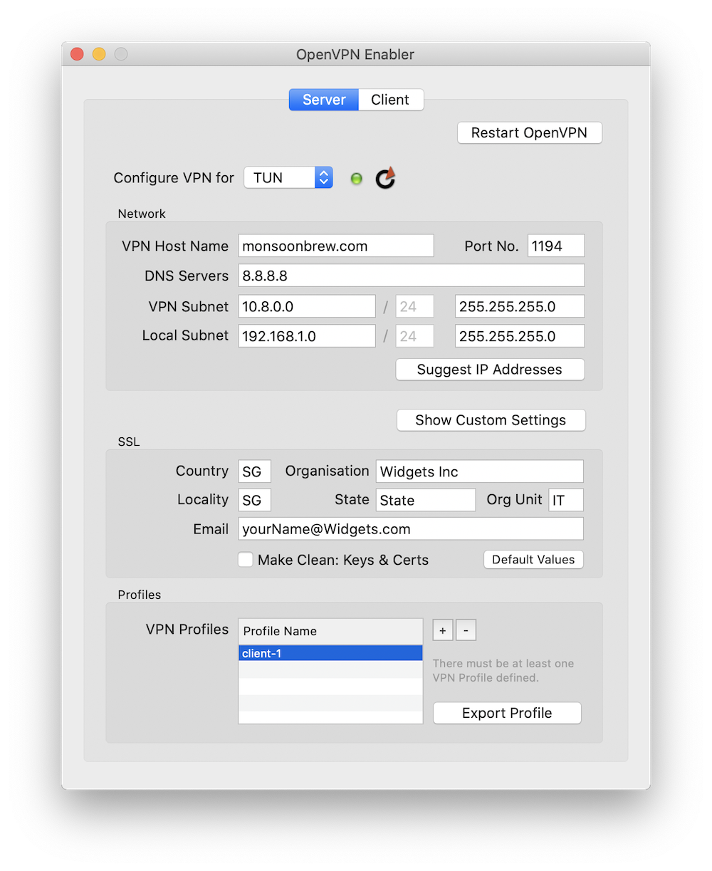 There are two panels — Server and Client. You use the same app to set up both the OpenVPN server and the OpenVPN client on the Mac.