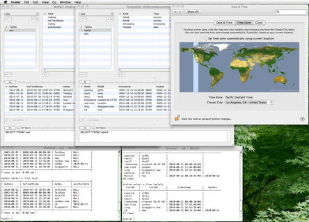 Liya for Snow Leopard just got updated to version 1.2.1. This version does something that I've always wanted - time zone support for the time stamp field in SQL databases. This is what I always wanted to do - you create time stamp fields in the SQL databases because you want to be very accurate about time - specifically, and very precisely, about when events are known to occur, or will occur in future. And what you want is that when you retrieve and review the information from a client - either from the iPhone or iPad, or from the Mac - when you're moving around the world, from one time zone to the other, you want these times to very specifically follow the local time, yet they still refer to the same precise points in absolute time. So when you land in LA after a flight from Singapore, and you update your landing time, someone in Singapore or anywhere else in the world will see that time mapped automatically to their local times zones.